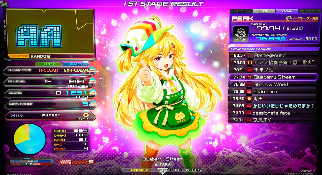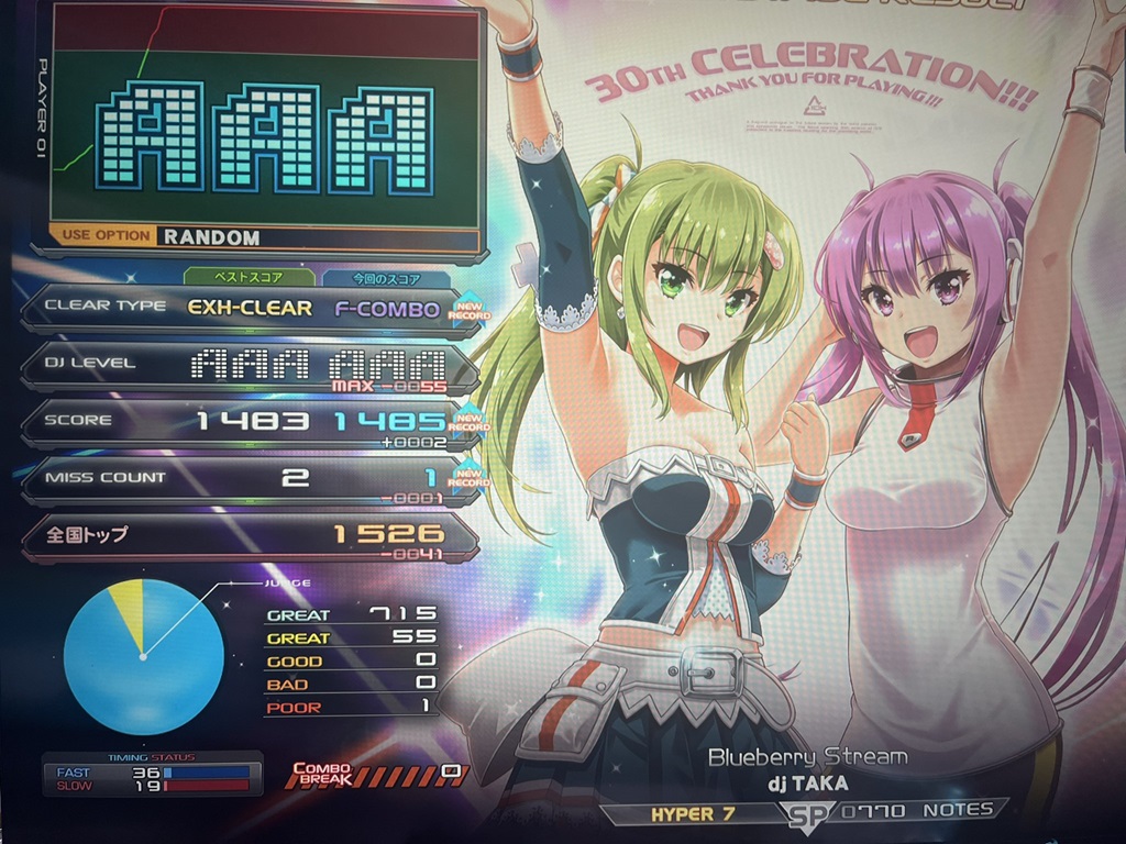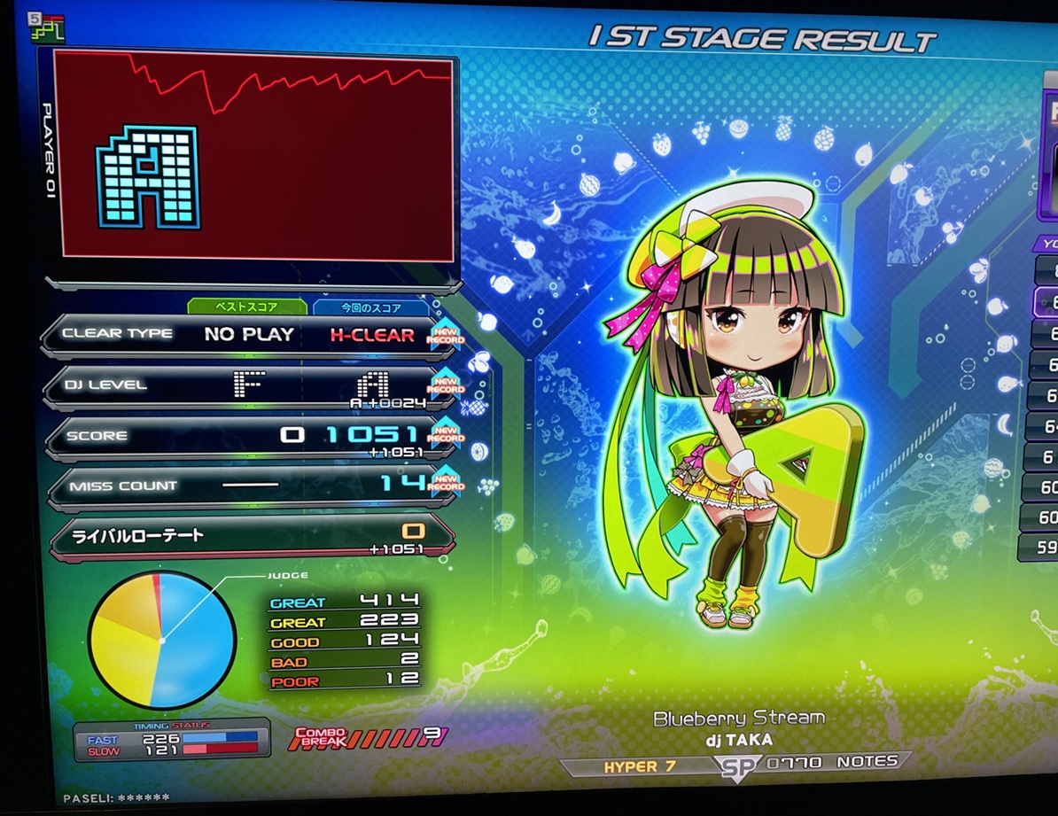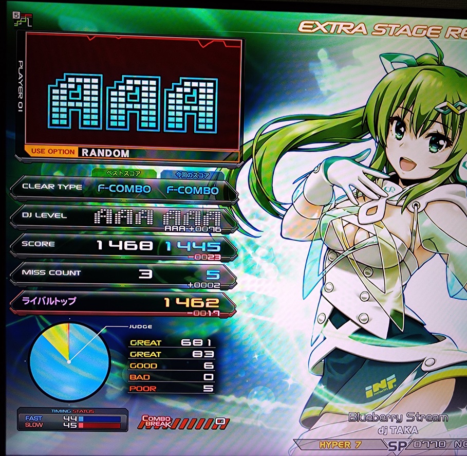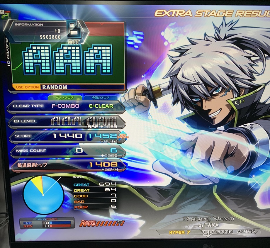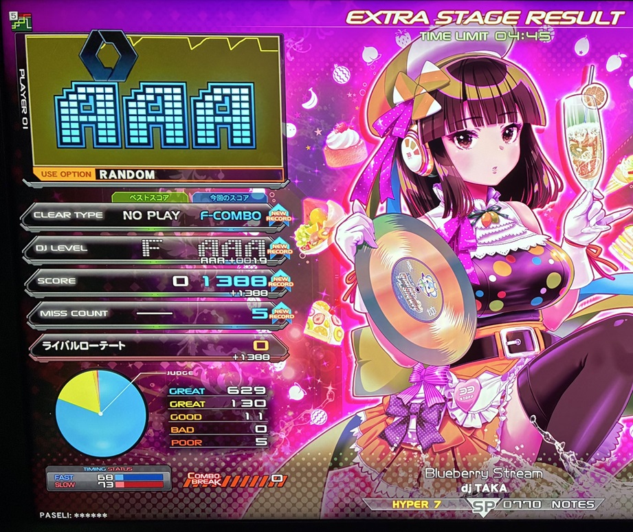 順位 | DJ NAME | プレイ環境 | オプション | 6th ☆7 Blueberry Stream MAX:1540 AAA:1369 |