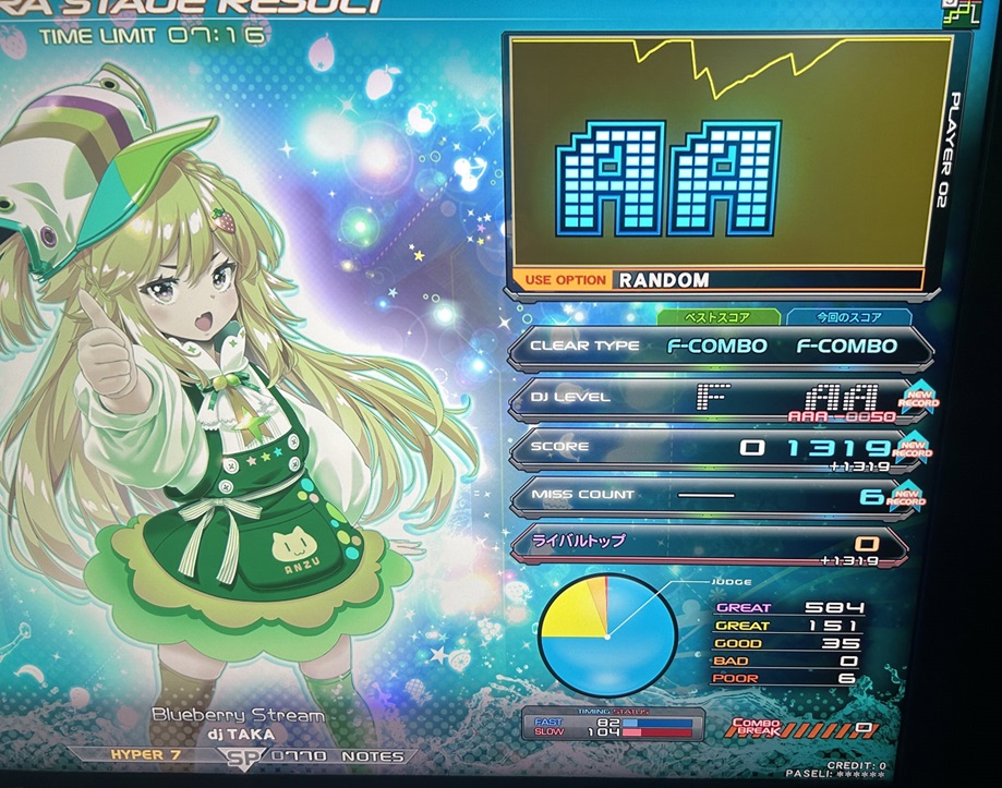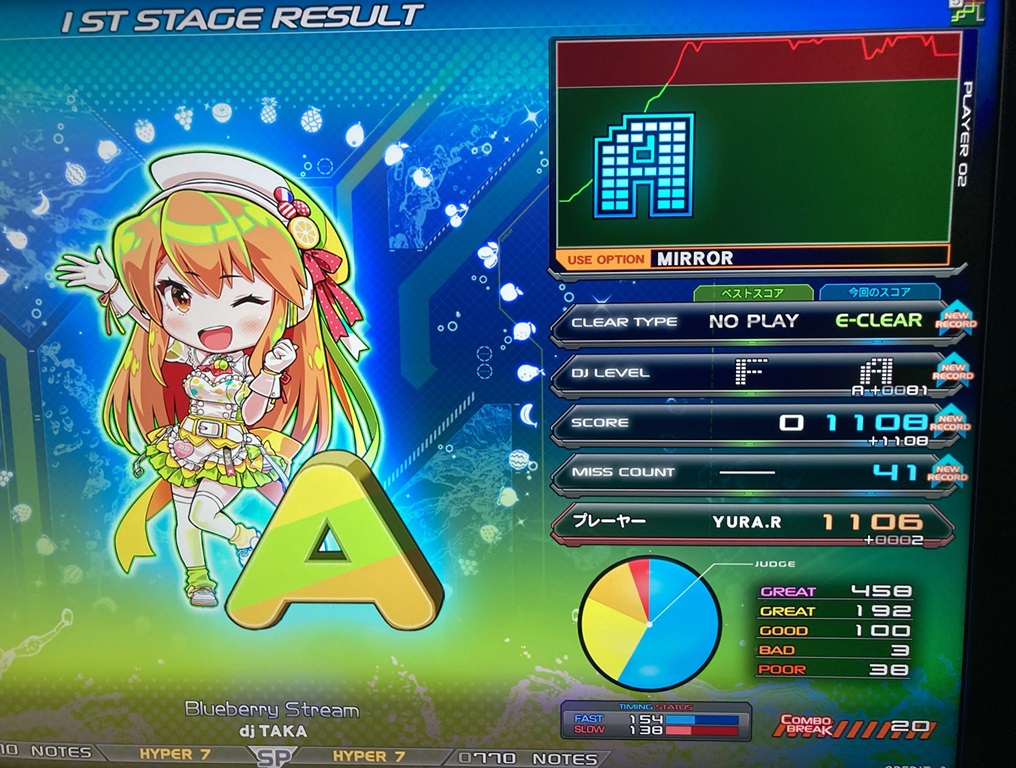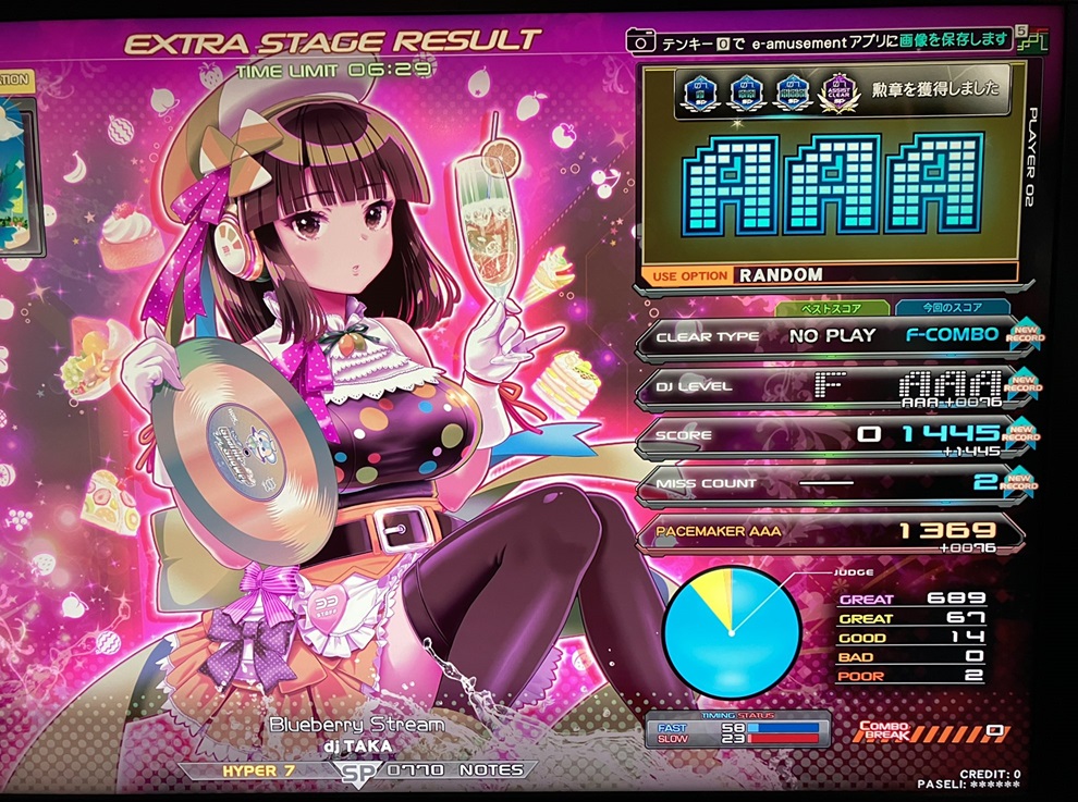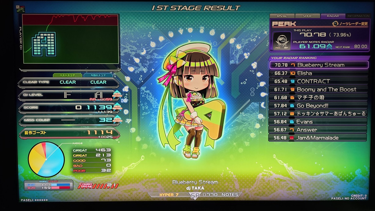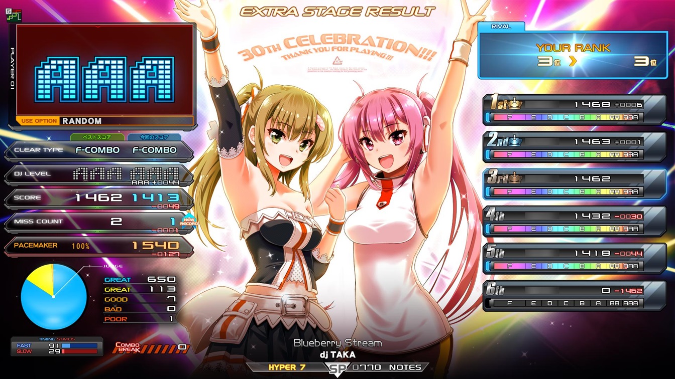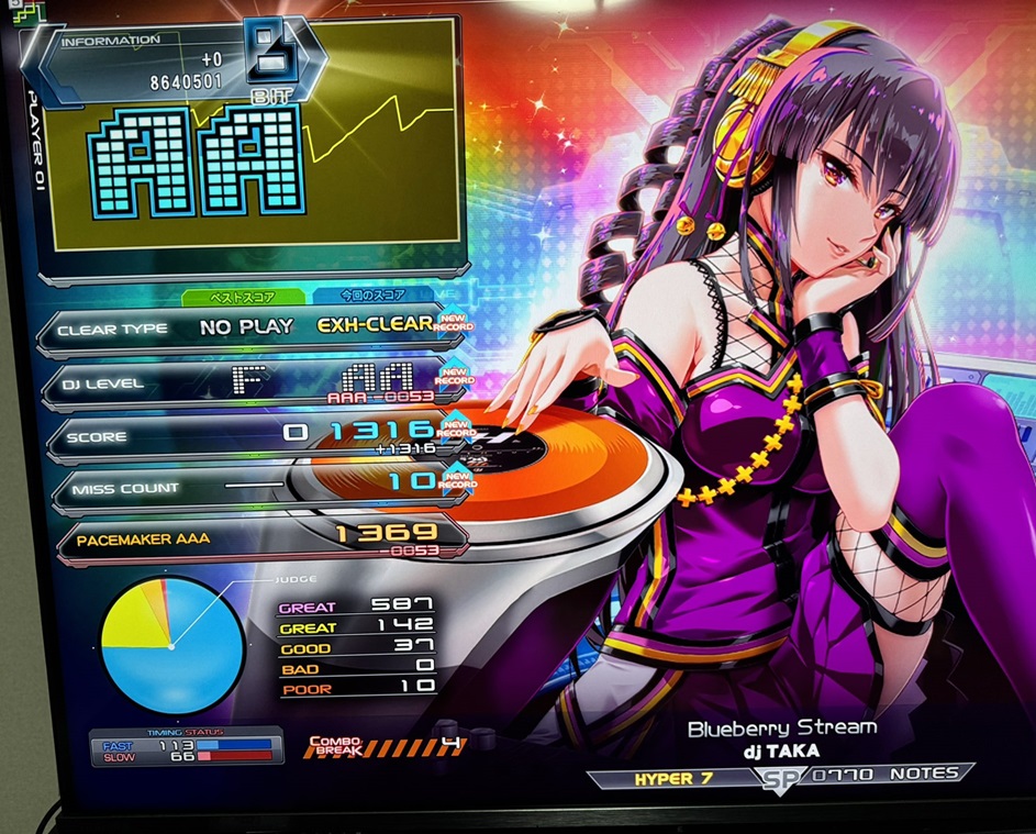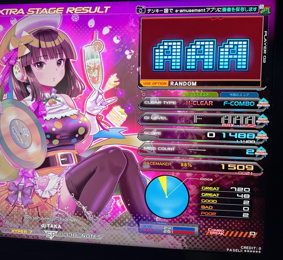 順位 | DJ NAME | プレイ環境 | オプション | 6th ☆7 Blueberry Stream MAX:1540 AAA:1369 |