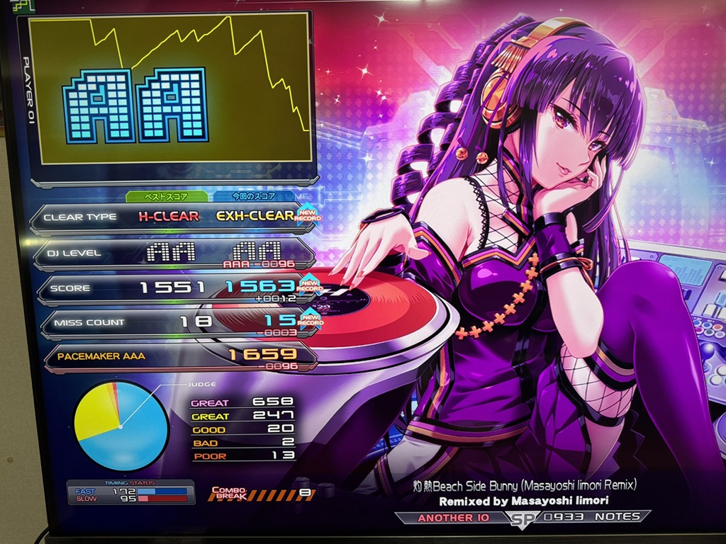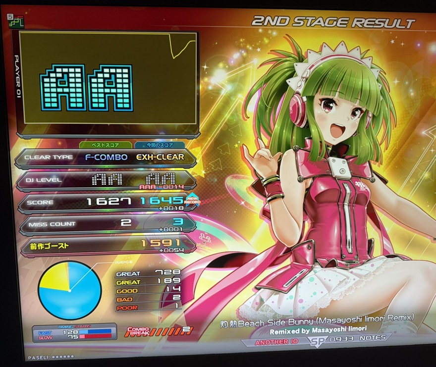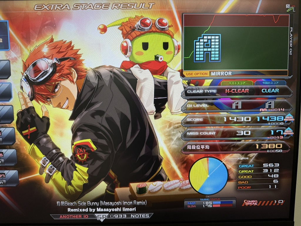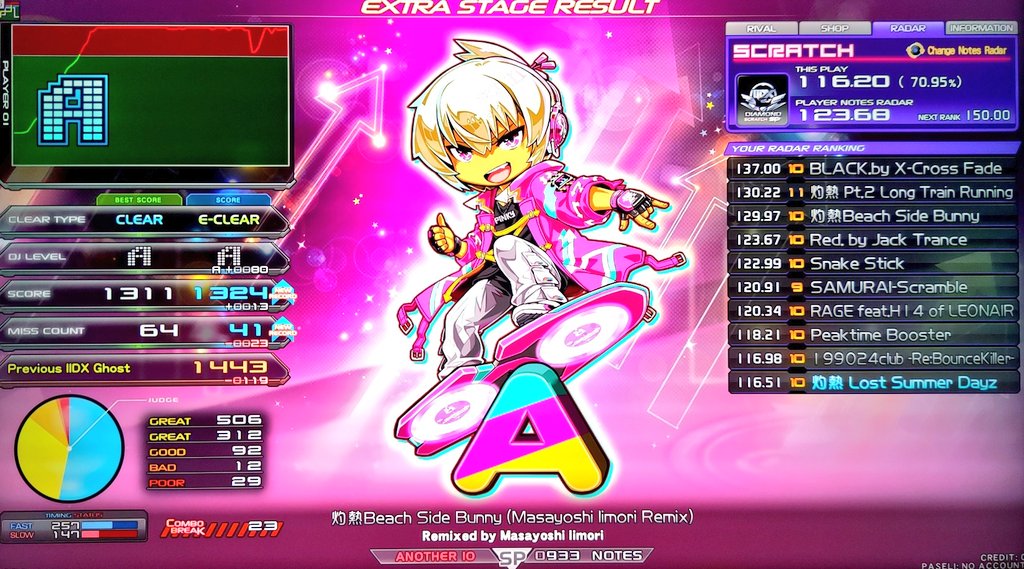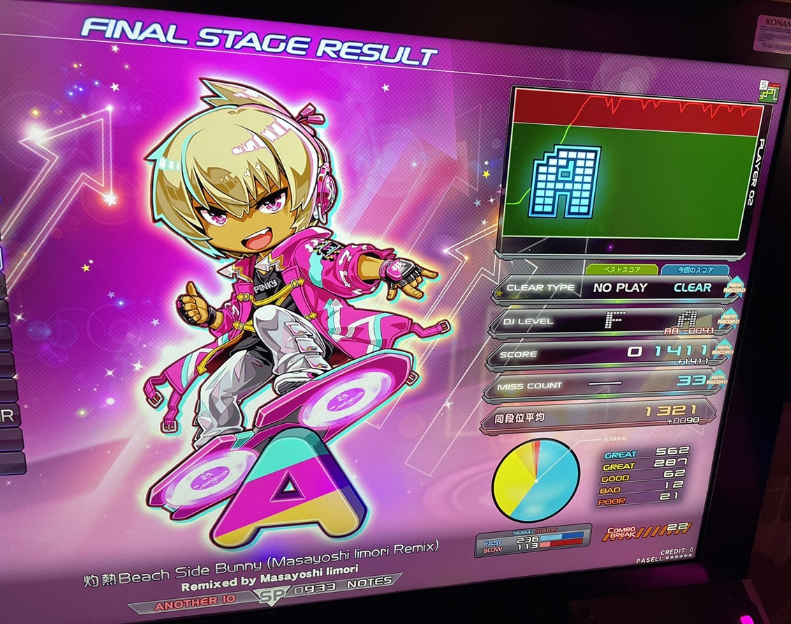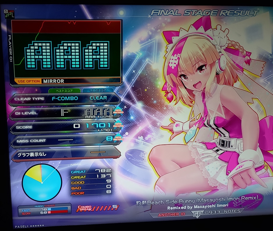 順位 | DJ NAME | プレイ環境 | オプション | HEROIC VERSE ☆10 灼熱Beach Side Bunny (Masayoshi Iimori Remix) MAX:1866 AAA:1659 |